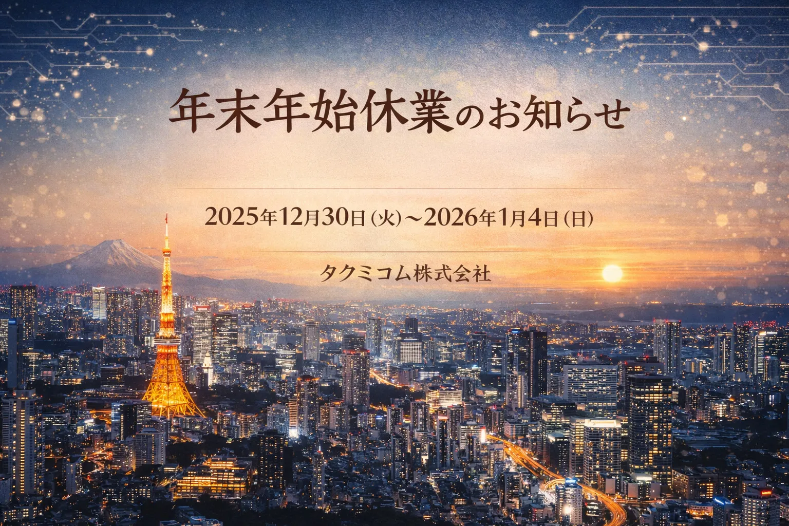 年末年始休業のお知らせ 投稿日: 2025年12月27日2025年12月27日 投稿者: takumicom平素より、タクミコム株式会社をご愛顧賜り、誠にありがとうございます。心より御礼申し上げます。誠に勝手ながら、下記の期間を年末年始休業とさせていただきます。■ 年末年始休業期間2025年12月30日(火)〜2026年1月4日(日)休業期間中にいただきましたお問い合わせにつきましては、2026年1月5日(月)より、順次対応させていただきます。お客様にはご不便をおかけいたしますが、何卒ご理解賜りますようお願い申し上げます。タクミコム株式会社